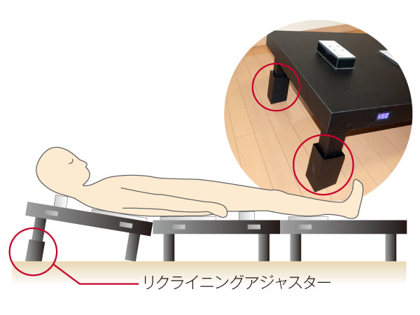 また、本体頭部のリクライニングアジャスターも付属。背中や腰の曲がった方にも対応しています。本体は3分割なので、高身長の方は、身体に冷却プレートを合わせられるように本体の間を空けて使用することもできます。